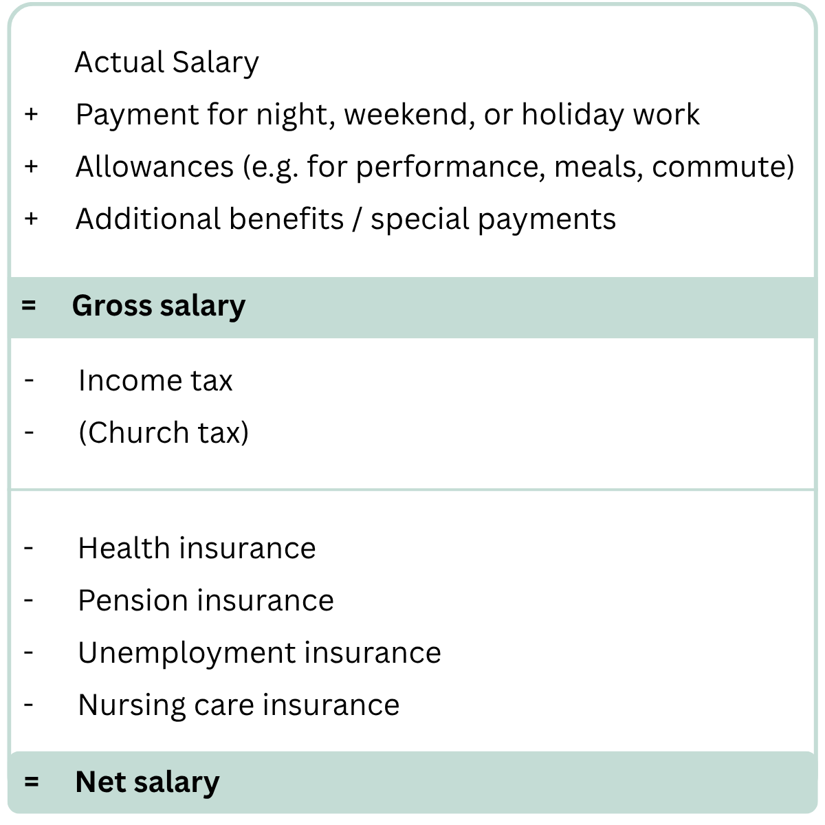Nota: Si quiere saber cuánto le queda de sueldo al final, una calculadora bruto-neto en Internet puede ayudarle. Para ello, necesita conocer detalles como su clase impositiva o la cotización al seguro de enfermedad. El resultado es un valor orientativo y puede variar ligeramente.